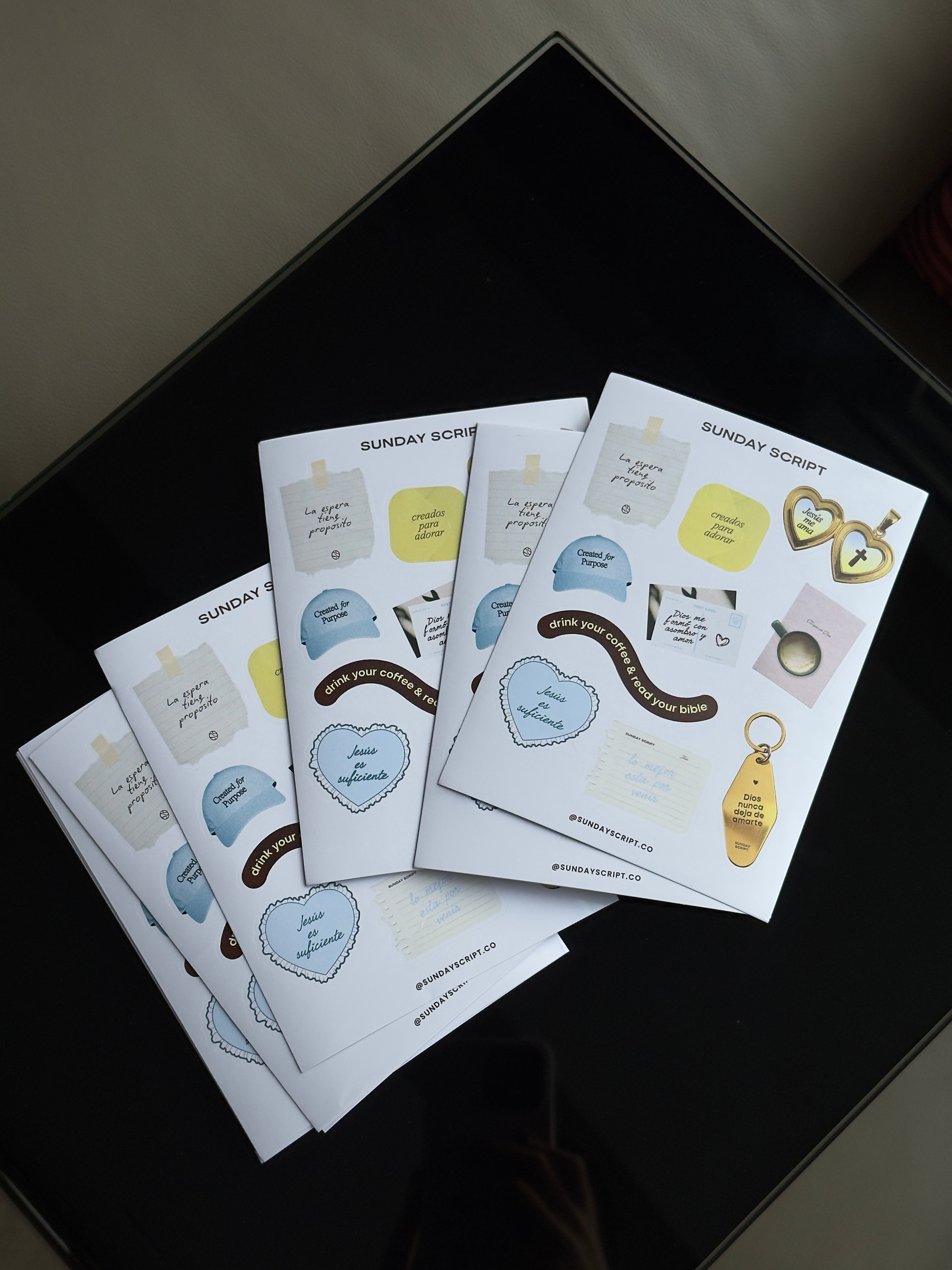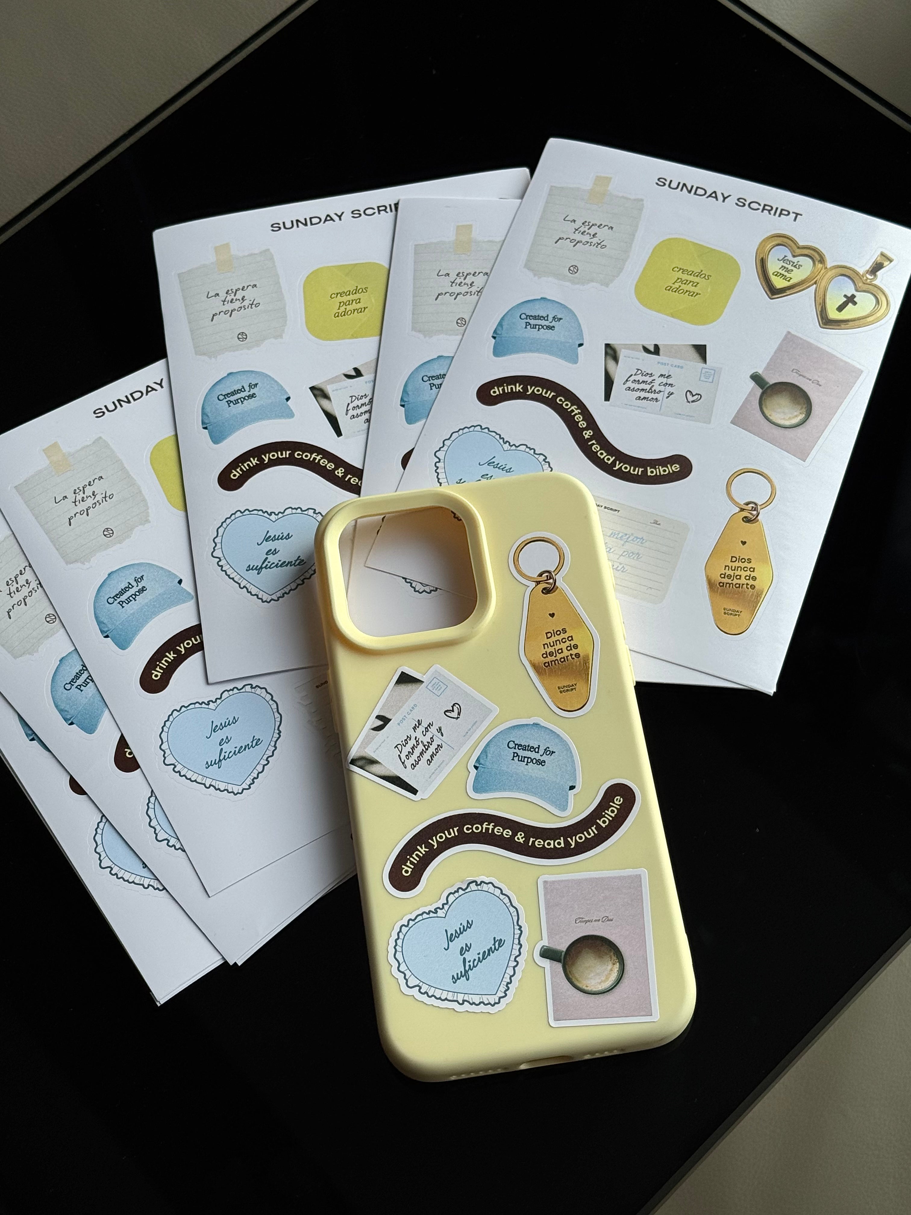 Este set incluye 10 stickers con mensajes que inspiran a recordar el amor y propósito de Dios en lo cotidiano. Diseñados con el estilo característico de Sunday Script, combinan frases en español e inglés como “Jesús me ama”, “La espera tiene propósito” y “Created for Purpose”, perfectas para acompañarte en tu tiempo devocional o decorar tus objetos favoritos.